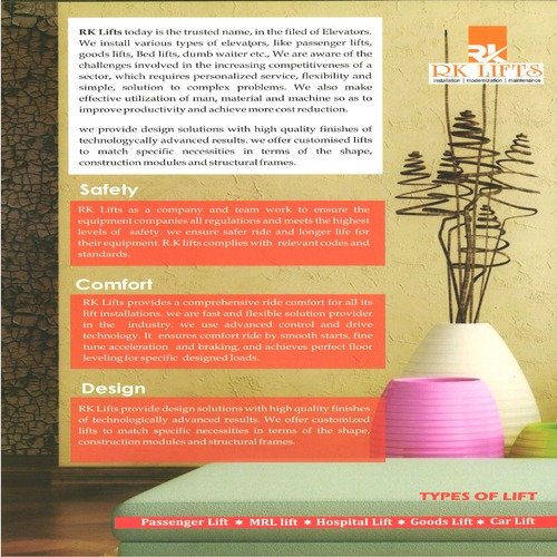 RK Lifts today is the trusted name, in the filed of Elevators. We install various types of elevators, like Hydraulic lift, passenger lifts, goods lifts, Bed lifts, dumb waiter Hospital Stretcher Lift, Car Lift etc., We are aware of the challenges involved in the increasing competitiveness of a sector, which requires personalized service, flexibility and simple, solution to complex problems. We also make effective utilization of man, material and machine so as to improve productivity and achieve more cost reduction.